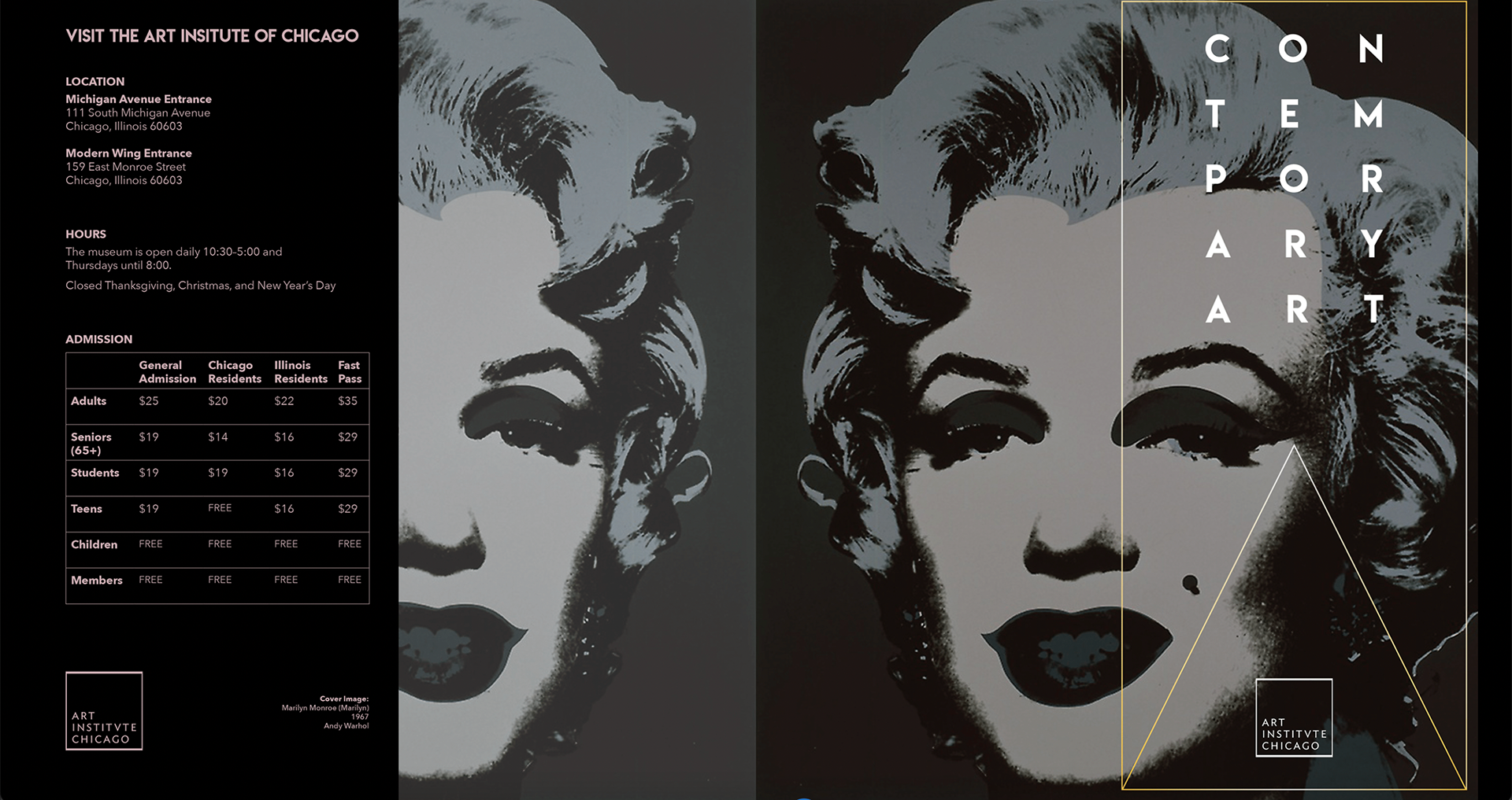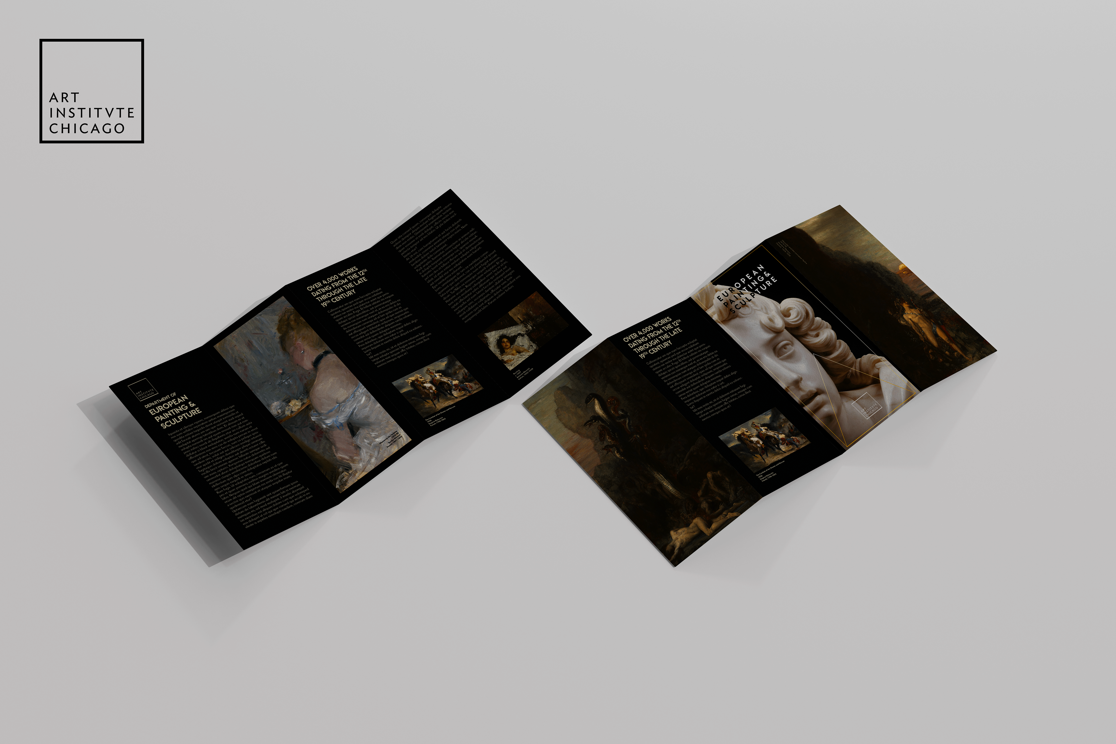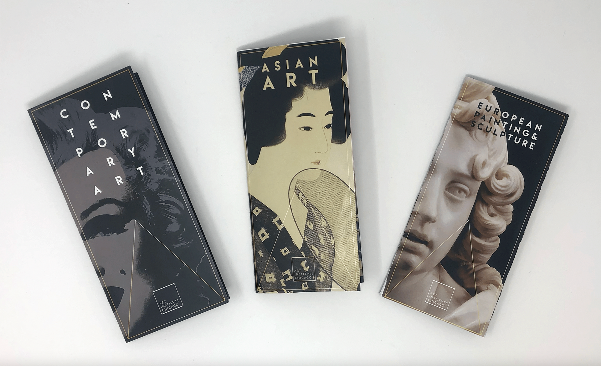 Design concepts for Art Institute of Chicago Pamphlets for their Contemporary Art, Asian Art, and European Painting & Sculpture exhibitions.