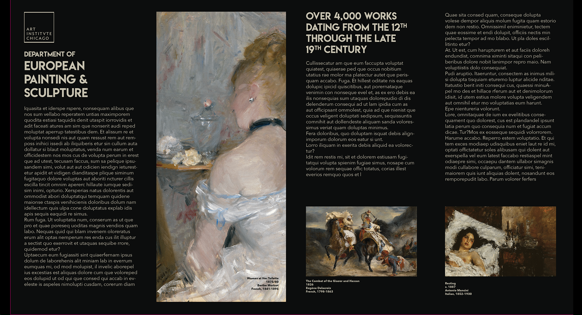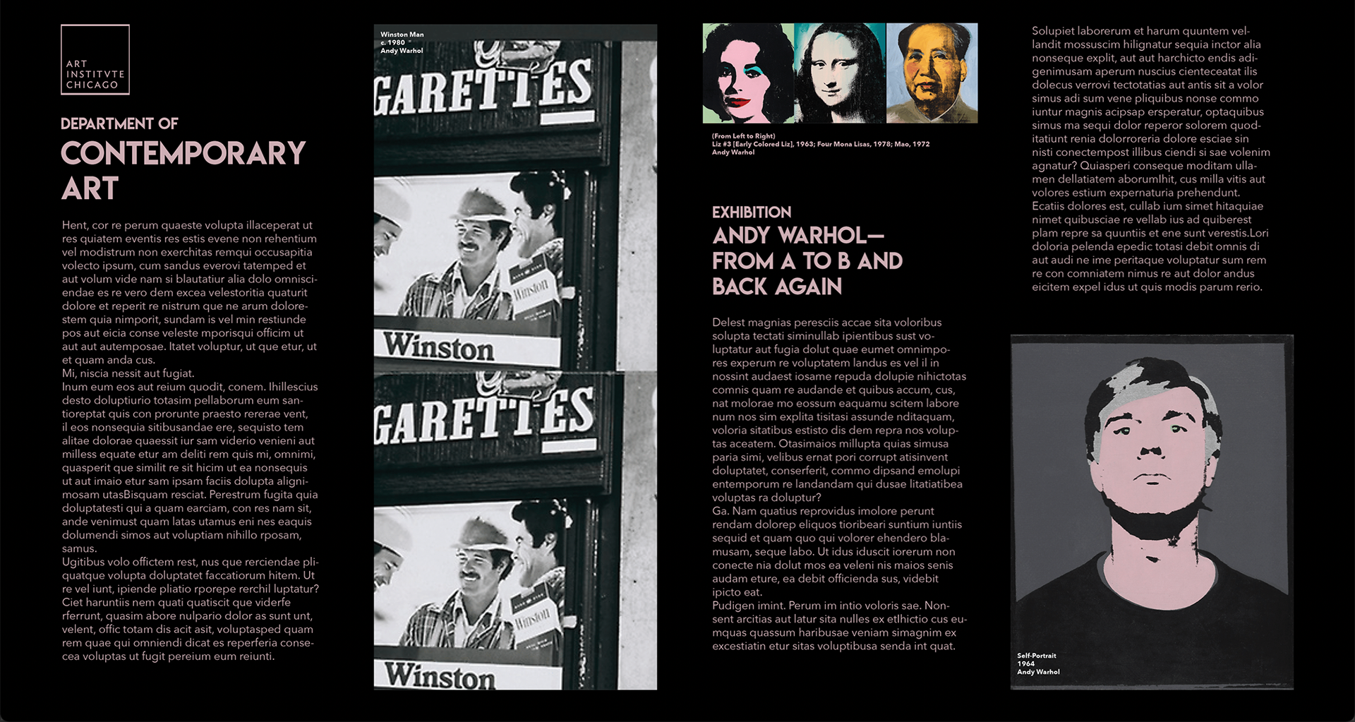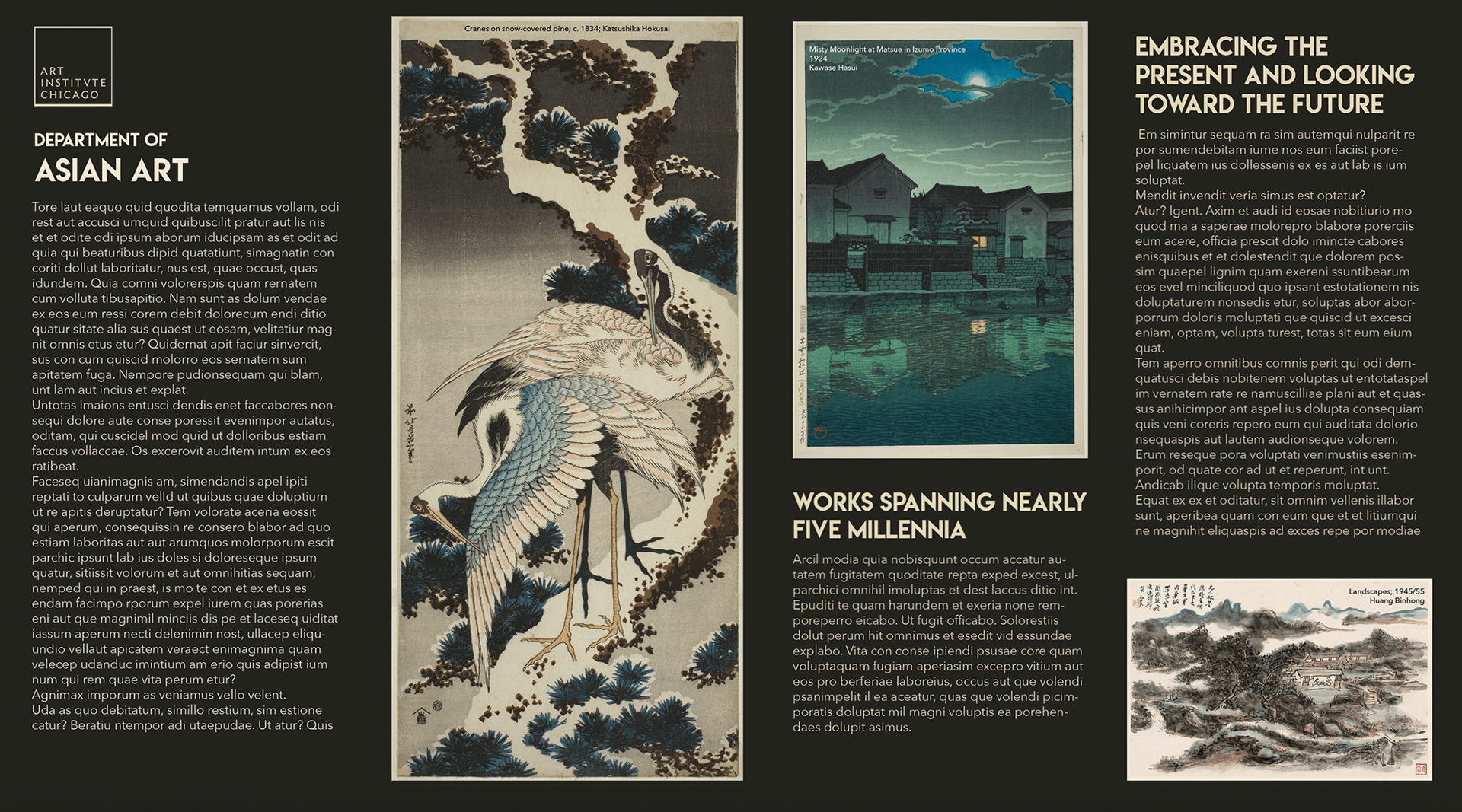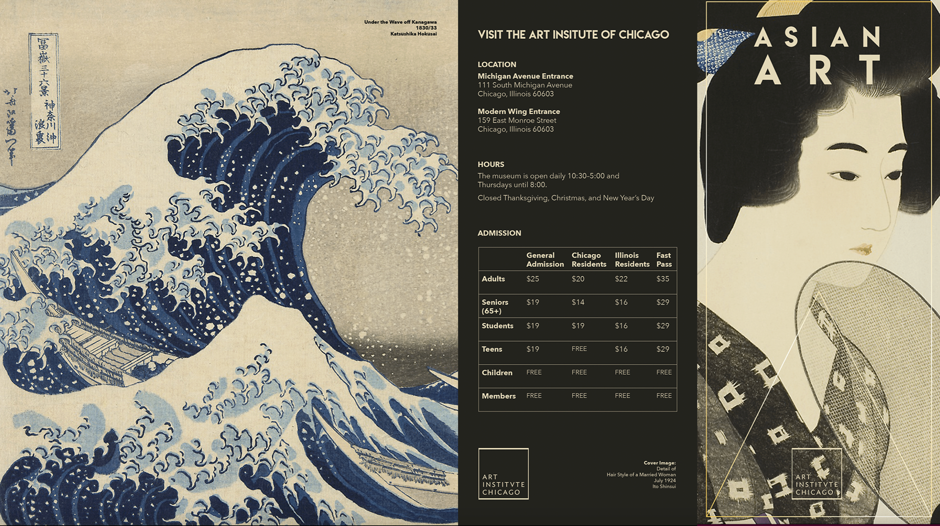 Design concepts for Art Institute of Chicago Pamphlets for their Contemporary Art, Asian Art, and European Painting & Sculpture exhibitions.